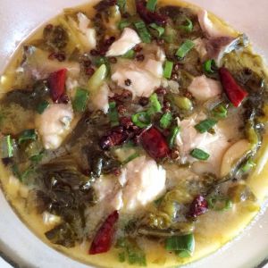 出锅后,接着再往锅内倒入油,烧热,放些花椒,炸香后,将热油淋在已经出锅的酸菜鱼上,再撒些葱花装饰提味。。酸菜鱼就做好啦。。