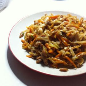 胡萝卜切丝,猪肉腌过后剁成肉末。下锅翻炒。放适量酱油调味。