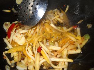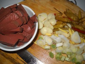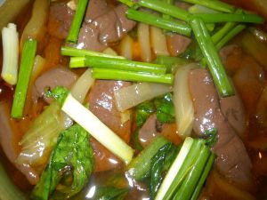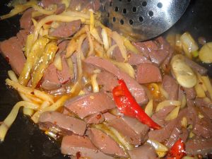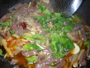 加入血旺继续炒,不要翻得太凶哈,血旺经不起折腾