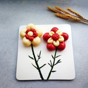取一个小白色面团揉圆,用刮板交错压出痕迹。蘸点水粘到花朵中间。