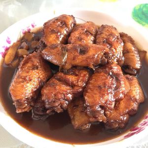 3.鸡翅微黄,翻炒中加入生抽和老抽,再放入葱姜,翻炒出香味,令鸡翅完全为酱色包裹。