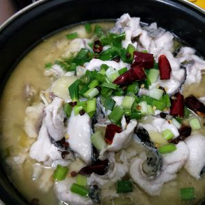 全部乘出,锅洗干净,热油放干椒和干花椒,鱼片上面放点葱,热油泼上。瞬间香味扑鼻。