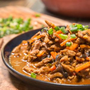 第一步,里脊肉洗净后切成细丝,胡萝卜去皮,连同黑木耳一起切成细丝,把姜蒜、葱白剁碎,葱叶部分和泡椒切小段,豆瓣酱细细剁碎。