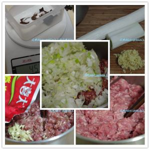 姜、葱切碎,一次再肉馅内加入盐,黄酱,香油,鸡精和姜末,再搅拌