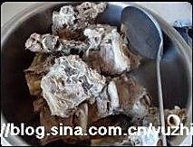 将羊蝎子捞出放在盆中,锅内的水倒掉不要。