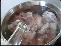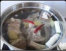 羊蝎子让摊主帮忙剁成块;买回的羊蝎子清水洗净;锅内放水,然后放羊蝎子,放少许料酒。