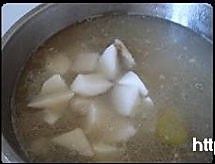 炖到锅内的羊蝎子已经有些脱骨的时候,(这个过程大概需要一个半到两个小时)放入切好的白萝卜一起炖(因为白萝卜是非常容易熟的东西,一定要最后放,放早了,萝卜就太烂了)。