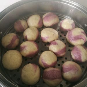 将紫薯泥倒入面粉揉成光滑面团,记得加入干酵母