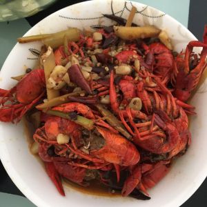 锅中倒油炒热 放入辣椒花椒八角桂皮生姜煸出香味……把腌好的虾盘中的水倒掉 放入锅中与调料一起爆炒至龙虾变成红色