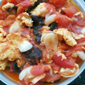 油热了先把鸡蛋炒好出锅。锅另加油下番茄、木耳、百合,茄子翻炒均匀再下入炒好的鸡蛋翻炒即可。