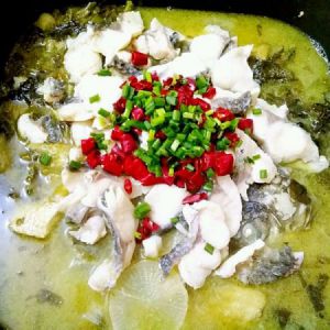 酸菜炒好后加入正在煮的鱼汤中,拌匀加入适量的盐、鸡精、白胡椒粉,继续煮20分钟;