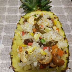 最后加入米饭,并用铲子将米饭压碎。然后加入盐,鱼露,椰子粉。最后再加入腰果还有葡萄干就完工了。