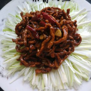 炒好的肉丝浇在葱丝上,吃的时候搭配豆腐皮即可。