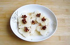 山药片中间挖洞,塞入红枣丝,放入盘中,调入蜂蜜、糖桂花