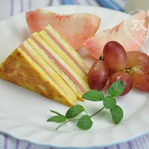 鸡蛋液打散,将馒头片两面裹匀蛋液,中间加上火腿片;