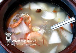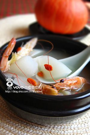 准备原料:白萝卜一根,明虾300g,清水6大杯,白果数个,枸杞一勺