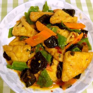 在煎豆腐剩下的热油中加入青椒木耳胡萝卜爆炒小会。