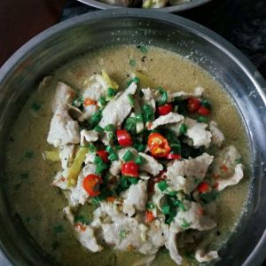 继续把塘煮开,加入腌制好的猪肉,继续煮开,再滚2分钟左右,即可捞起来上锅,把猪肉放到刚刚煮熟的小白菜上面,然后把汤淋进去,上面撒一点葱花,和辣椒段,然后再开锅,放适量花生油,煮滚,然后把油倒进蝶里,会发出滋滋的声音,哇,大功告成