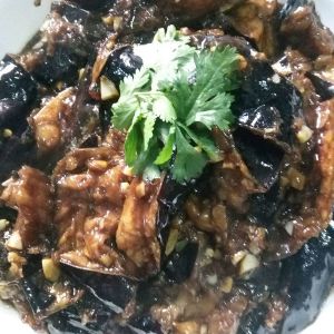 蒜切成蒜蓉,炸过茄子的油锅留少许油,放入蒜蓉爆香,放入炸好的茄子,放老抽,生抽,糖,盐,鸡精,加半碗清水,翻炒,收汁,出锅。