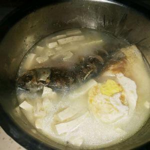 把煎好的鲫鱼和煎蛋放入炖锅中,再倒入开水,一定要开水哦,大火炖煮,开锅后转小火,烧十五分钟