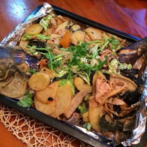 把炒熟的菜和汤汁倒入烤熟的鱼身上,放入烤箱200度10分钟,出炉前撒香菜,蒜泥,芝麻即可!