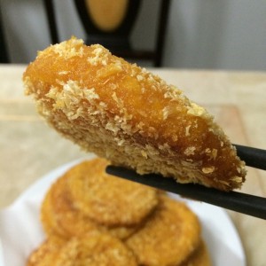 做成自己想要的形状,我是做了南瓜饼和南瓜团子,而后滚上面包糠