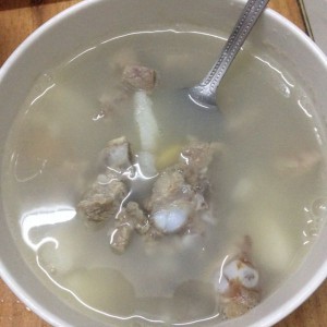 水开后将全部材料放入锅中,注意,因为淮山很易粘锅,煮时要常常搅拌,待汤水变乳白色后即可,加盐,鸡粉,少许姜,就OK啦