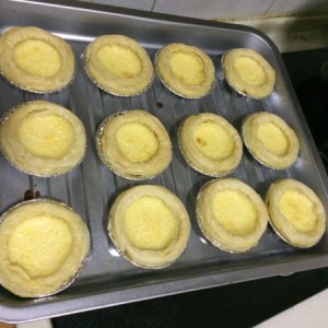 淡奶油和牛奶和糖混合,两个蛋黄和低筋粉混合。然后把两者混合。分装到12个蛋挞里