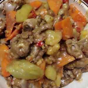 锅里热油多点、把辣椒生姜花椒放下去爆香、放适量盐不要太多、然后把排骨倒下去、炒三分钟.放水腌过排骨就行、盖锅!等水烧开就把青瓜土豆胡萝卜倒下去煮十五分钟!放味精、起锅