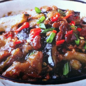 茄子段入味后放入蒜末、红椒段和海天草菇老抽起锅,最后撒上香葱段即可。