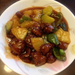 用两大匙油炒香蒜末,加入小黄瓜和甜椒炒熟,加入C料超匀,再放入炸酥的排骨和菠萝,拌匀即可装盘