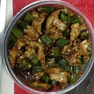三分钟后加入肉片翻炒 老抽上色 最后加盐 出锅。秋葵的脆滑,香菇的柔嫩,肉片的鲜香!蛮好吃的!不爱吃白卡卡的猪肉,so加了点老抽提色!