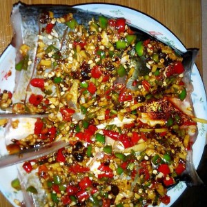 把盆里腌好的鱼水倒掉~姜丝铺在盆底~把拌好的调料均匀铺在鱼头上~浇点蒸鱼適油……放入已经烧开水的锅蒸~大概十五分钟……放点葱花把热油浇在鱼身上即可