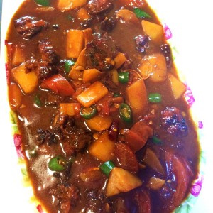 待汁变稠后倒入番茄青椒等,并加盐 鸡精 焖一段时间,入味和收汁