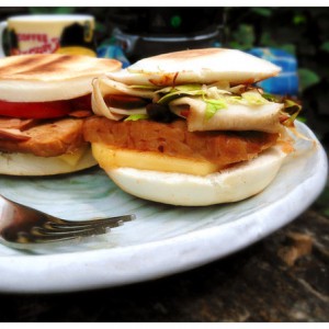 5分钟后,拉开中层滑板,让烙熟的菇肠卷、菜丝和馒头片,和下面的合成完整一体;