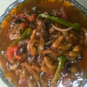 放入辅菜,茄条,倒入糖醋汁翻炒,加耗油味精出锅即可!