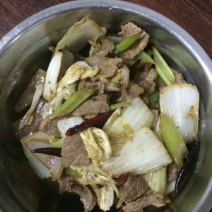 起油锅把辣椒 花椒 洋葱爆香放肉类炒成八成熟,放烫好的蔬菜 ,加入调味料翻炒入味,就可以起锅了