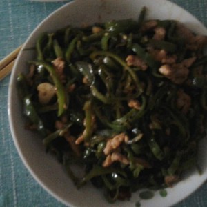 将腌好的肉丝和蒜子放入锅中炒,再放青椒,盐,生抽,鸡精,就ok了
