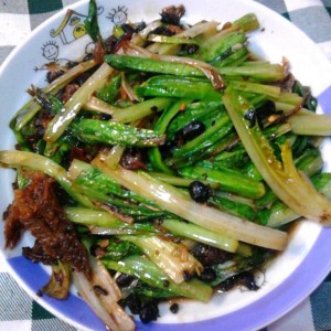 到油麦菜发软出水下豆豉鱼 ,适量盐,最后放醋呛一下 ,翻炒均匀出锅。