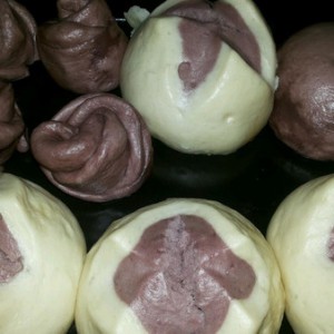 做面团的时候要排气揉好,紫薯面用白面赶成皮包住,用刀子在上面划成两条缝程十字状,玫瑰花的做法是,分成不同的面团(跟水饺皮一样的做法)把5个皮依次重叠用筷子在中间压条线然后一边慢慢卷起,再从中间切开就成了玫瑰花了,做好形状放锅里醒30分钟,开火30分钟煮好