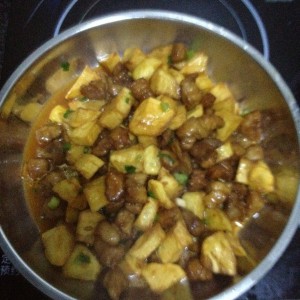 锅烧热后,把调好的汁倒入锅中煮开后,再倒入炸好的瘦肉、土豆,稍微翻炒一下,再撒点葱花,即可盛盘。