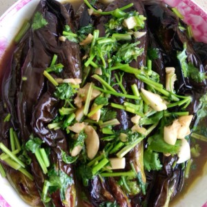 将蒜拍扁,切碎,加入炖好的茄子,炒一分钟