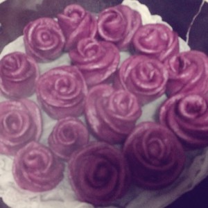 在案板上洒点面粉,取出面团,80g一份分为数份。每一份又切分为6小团,其中5个小面团用擀面杖擀成圆饼状,剩下的1个小面团揉搓成橄榄状,依次层叠放好,由小橄榄处(即玫瑰花芯)开始卷起。中间切开一分为二,成两朵玫瑰花,底部抹平整