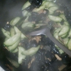 锅中再放入少许食用油加入五花肉,炒八成熟,加入木耳,翻炒一阵再加入黄瓜翻炒,加入食盐。快炒熟后加入鸡蛋,翻炒一会就ok啦