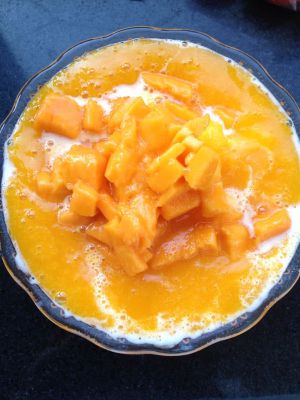 把芒果汁倒在牛奶上、中间放上一些芒果肉,开吃吧!