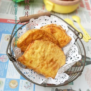 锅内放油烧热,馒头片两面粘匀蛋液,下锅中炸成金黄色捞出控油