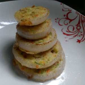 1、将土豆切薄片蒸熟,胡萝卜、豌豆、一部分洋葱切丁,和土豆泥拌匀