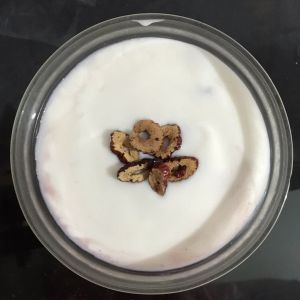 浇上酸奶,撒枣片,放入冰箱第二天就可以吃了