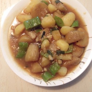 葱蒜炒出香味,放入青椒炒片刻,接着放入土豆、茄子,将调好的酱料倒入,小火炖3-5分钟