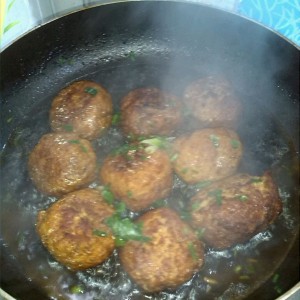 将锅内油倒出后,不用洗锅,直接把炸好的肉团子导入锅里,加入一大碗水,依次加入老抽、醋、料酒搅拌后盖上锅盖,焖煮5—10分钟